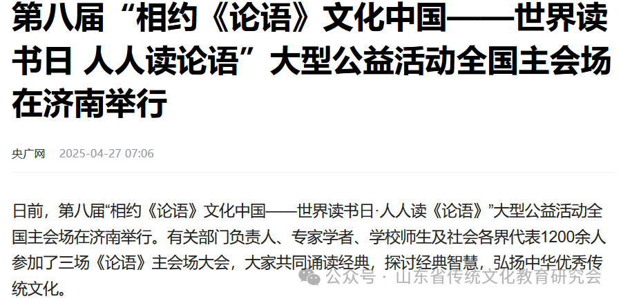 山东是儒家文化发源地,《论语》从山东诞生。山东举办诵读《论语》大型公益活动,彰显儒家文化发源地的使命与担当。
