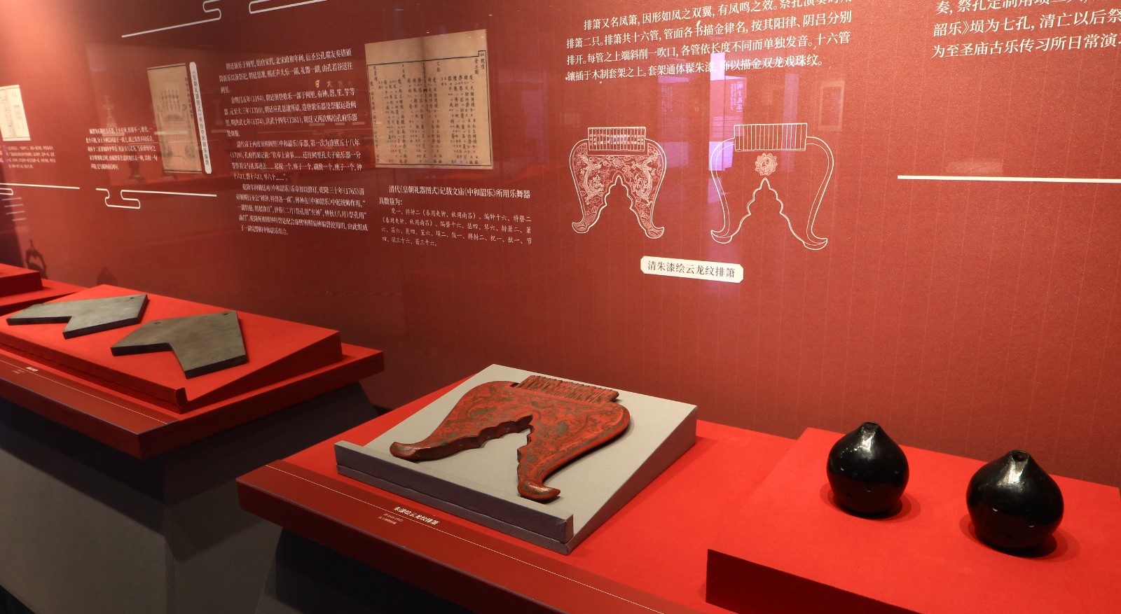 清代石编磬、朱漆绘云龙纹排箫,民国时期陶埙。