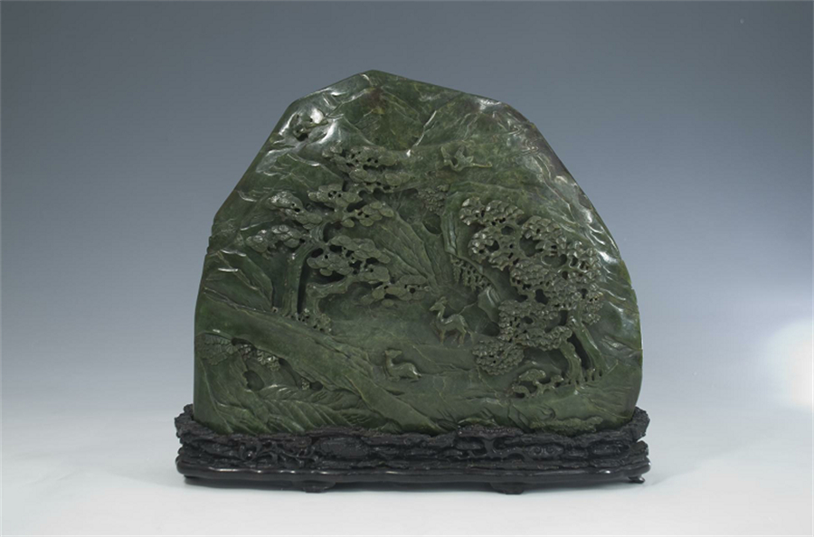 此玉山子色泽沉静清雅,质地致密细腻,精雕细琢,因势就形,景致布局周密,层次清晰,立体感强。器取玉石自然之形,一面雕琢出一幅仙山之景,里面有古柏苍松、楼阁和七位仙人,仙人们或在交谈,或在观景,或在休憩,其乐融融;另一面雕琢出一幅大自然之美景,苍松古柏,鹿儿在森林中或奔跑、或休憩,仙鹤在云雾里飞翔,好一幅美景之图。