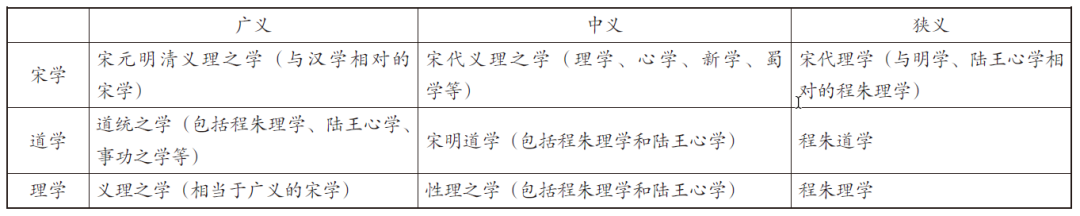 从概念的交涉关系来看,“宋学”“道学”“理学”这三个宋明儒学概念存在错综复杂的交涉关系,虽然命名的角度和发展的脉络有所不同,但大体在广义、中义和狭义上分别相当,在历史与现实(研究)中往往可以通用。具体来说,广义的“宋学”与“理学”都指义理之学,而广义的“道学”指包括宋明儒学各派在内的道统之学,其范围与广义的“宋学”“理学”大体相当。因为道统着眼于历史传承,而义理则着眼于诠释方式,两者只是从不同方面(历史或逻辑)对宋明儒学的指称。同样,中义的“道学”“理学”分别指道统与性理之学,与上述广义的情况类似,只是其范围主要局限于程朱理学与陆王心学。最后,狭义的“宋学”“道学”“理学”大体上都是指宋明儒学中的程朱理学。需要指出的是,以上分别将“宋学”“道学”“理学”区分为广义、中义、狭义,只是从宋明儒学的领域出发。事实上,如上文中所述,“宋学”“道学”“理学”都还有其他意义,如“宋学”概念可以泛指宋代的一切学术思想乃至文艺科技等领域(不局限于儒学或哲学);“道学”概念更是贯穿儒释道乃至中国的一切思想文化之中;“理学”概念也存在于儒释之中,并且被用于泛指中国的哲学思想(如前述贾丰臻的用例)。但由于这些意义一般都超出了宋明儒学的范围,因此不在笔者的主要考虑范围之内(虽然笔者为了追根溯源和辨析名义的需要也提到了这些意义)。同时,之所以区分广义、中义和狭义这三层意义,是基于历史脉络、逻辑结构(思想体系)与现实研究的多方面考虑,因为在宋明儒学发展的历史上,“宋学”“道学”“理学”主要包括这三层涵义,并且往往可以通用。这一点从上文的论述中可以看出。而在逻辑结构上,这三个宋明儒学概念往往构成紧密相连的三个层面的思想体系,如田浩就将“宋学”“道学”“理学”的序列视作父子概念的关系,主张宋学(广义)包括道学(中义),道学(中义)又包括理学(狭义、程朱理学)。这也是笔者采取的一般意义。而在现实研究中,这三层意义也是宋明儒学的研究中使用最多的,广泛见于学术史、思想史、哲学史的研究中。总之,将“宋学”“道学”“理学”这三个宋明儒学传统概念分别区分为广、中、狭三义是基于历史、逻辑与现实的自然选择,并非笔者刻意为之。事实上,目前学界对“宋学”“道学”“理学”的研究除了广义和狭义的区分外,往往也是区分为三层意义,只是没有像笔者这样明确的以广、中、狭三义来命名,并且已有的研究往往不考虑这三个概念的交涉关系。这也是笔者自认为较之学界已有研究有所推进的地方。