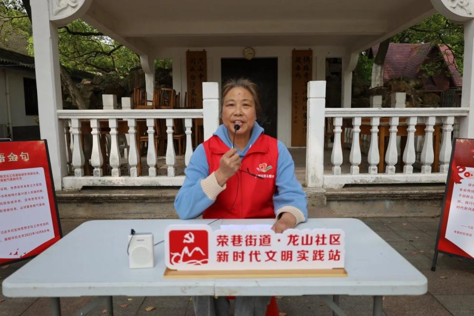在东大池莲心亭内,孙艳艳为荣巷街道、龙山社区代表及队员们讲述了《论语》中的廉政故事。“季康子问政于孔子,孔子对曰:‘政者,正也。子帅以正,孰敢不正?’”从《论语·颜渊》中的廉洁奉公,到《论语·述而》中的淡泊名利,她将古文的涵义与其中蕴含的廉政文化和精神娓娓道来,号召各位代表将廉洁意识融入工作和生活中,切实筑牢思想防线,用实干担当唱响廉洁“主旋律”。