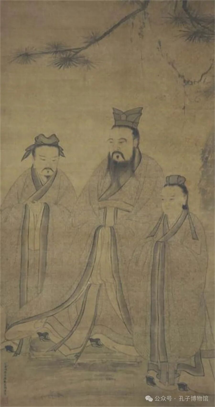 图中绘有至圣孔子、复圣颜回、宗圣曾参三位先哲。孔子居中,礼冠、宽衣、博带、乌履,长须下垂,神态安详,展现出谦卑有礼、雍容大度的圣人风范。弟子颜回侍立其左侧,曾参侍立其右侧,均头戴巾帻,着交领大袖长衣,恭敬侍立倾听孔子教诲,神态安详,文质彬彬。三人衣纹和服饰均由蝇头小楷《论语》书成。