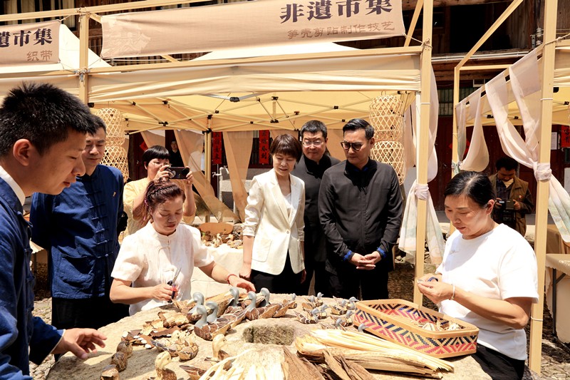 在盘峰乡榉溪村参观磐安县非遗市集。