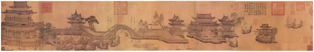 赏古画:元代画家王振鹏在元武宗至大三年(1310年)绘制的《龙池竞渡图》(绢本水墨,纵30.2厘米,横243.8厘米),描绘了北宋崇宁年间农历三月初三,宋徽宗赵佶和官员在东京汴梁西北的宫廷后苑金明池观看龙舟竞渡的场景,展现了龙舟争标、万人争睹的壮观景象。