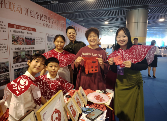 泰山冯玉祥小学孔子学堂师生受邀参加现场动态展演,成为一大亮点。学校的孩子们与纸言剪语的老师们通力合作,热情地向与会代表传授泰山剪纸的独特魅力。
