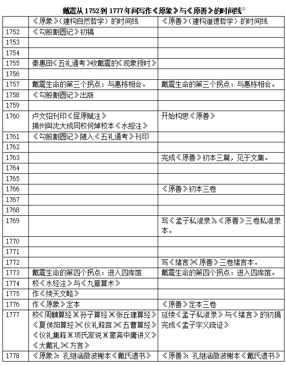 戴震的道德哲学建构主要体现在《原善》里。《原善》的成书有一条清晰的发展线索。大约在1763年,他开始思考并撰稿《原善》。这时戴震已与惠栋划清界限,并开始建构自己的道德哲学。因为当时大家都觉得戴震是个研究天文历算的学者,没办法谈道德哲学,他就非常不服气,于是决定建构道德哲学。戴震在1766年完成了《原善》初本,在1769年撰写了《孟子私淑录》,在1772年撰写《绪言》,在1776年完成《原善》定本。在1776与1777年,戴震把《孟子私淑录》与《绪言》改写成了最著名的解构宋明理学的《孟子字义疏证》。戴震在四库馆认识了很多朋友,其中一位是当时江南著名的诗人彭允初(1740-1792)。彭允初的思想融合佛家和儒家,他将全部著作给戴震看。戴震看完之后,仔细的予以分析,回了一封很长的信《答彭进士允初书》。在这封信里面提到他的《原善》与《孟子字义疏证》。我们现在把《原象》与《原善》的时间线整理如下: