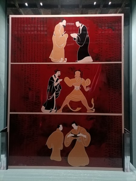 走进展厅,第一件展品是西汉海昏侯墓出土的孔子衣镜(复制品)。衣镜背面绘制了3组人物,其中最上一栏左为孔子,右为颜回。图像两侧墨书内容为相应的人物传记。这是目前所见考古出土文物中最早的孔子形象,可见汉代帝王对孔子及儒学的重视。