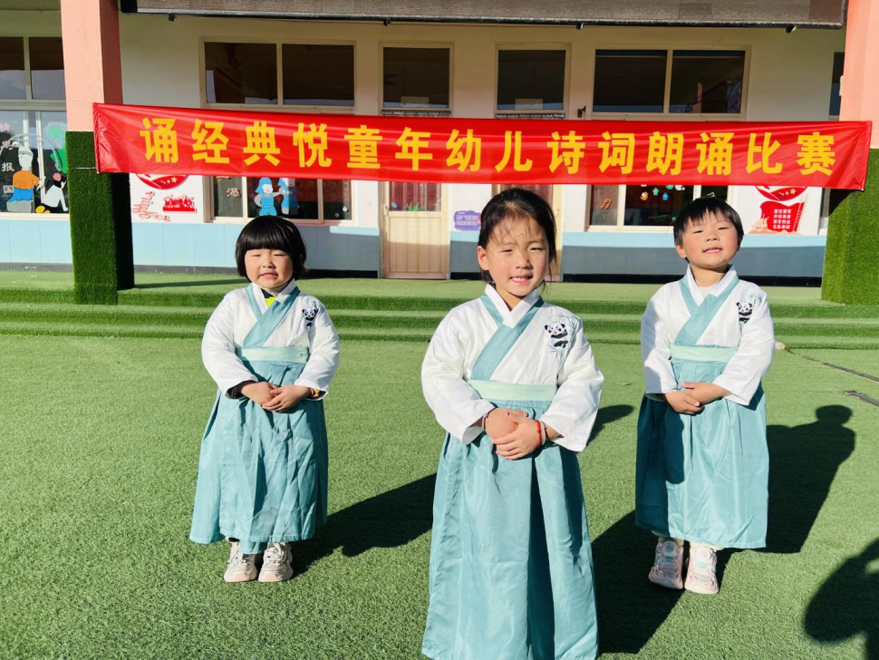 比赛当天,幼儿园里诗意盎然。小选手们身着色彩鲜艳的传统服饰,或手持书卷,或头戴配饰,宛如从古代走来的小诗人,可爱又不失典雅。他们用清脆悦耳、充满童真的声音朗诵着一首首经典诗词,《山行》《三字经》《游子吟》等佳作在幼儿园中回荡。