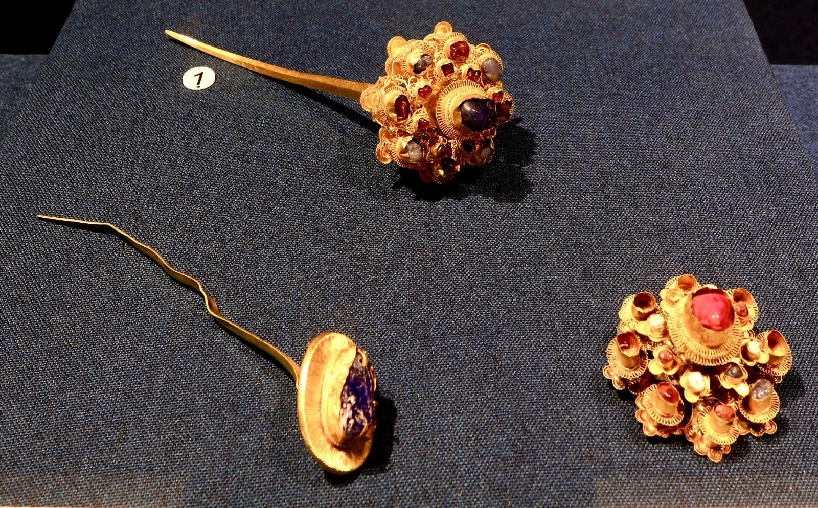 金镶宝蜂蝶赶菊挑心、“四马投唐图”金分心、金镶宝三大士分心等。