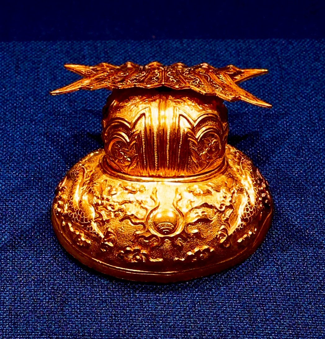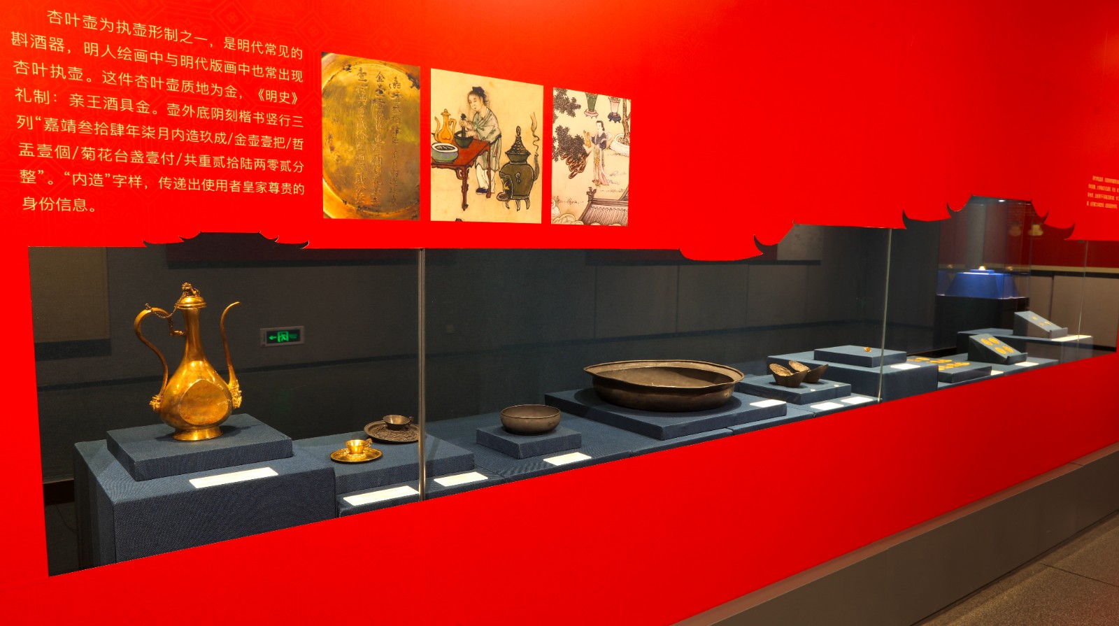明代杏叶金壶、金盘盏、银盂、银盆、银锭、金冥币等。