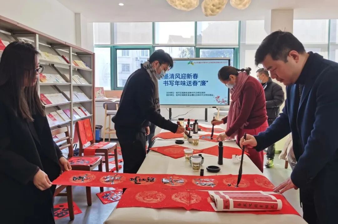 1月9日上午,嘉兴市山东商会孔子学堂走进共建单位城南街道金穗社区,与社区共同开展“翰墨清风迎新春 书写年味送春‘廉’”文化走亲活动,为社区文化添彩。