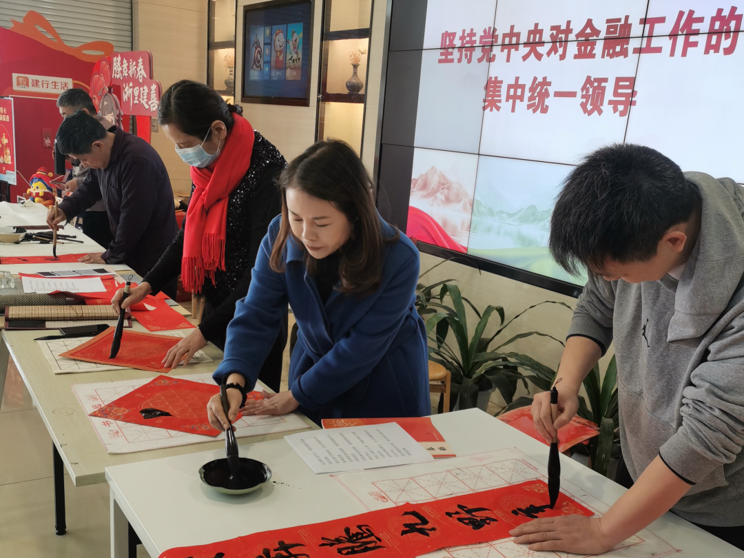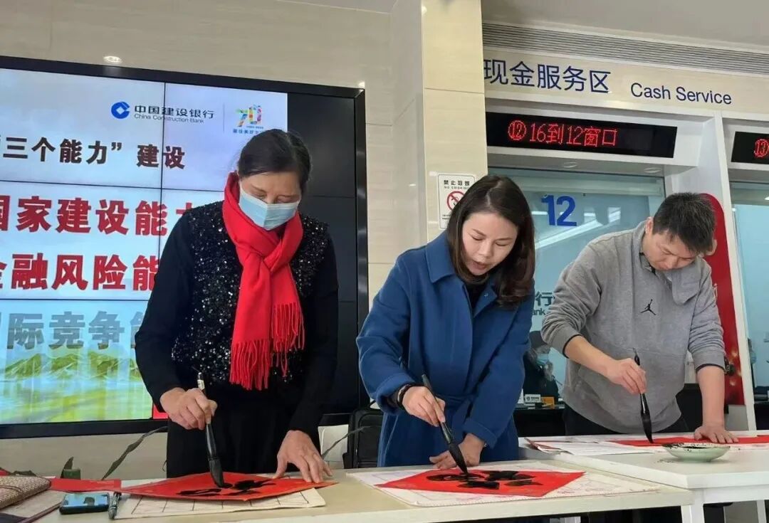 1月13日上午,嘉兴市山东商会孔子学堂的公益书法老师们走进建设银行南湖支行,现场挥毫泼墨,为市民书写福字与春联,提前送上新春祝福,引得银行内一片叫好。商会轮值会长、常务副会长刘宝来、理事朱王衍生一起参加了本次活动。