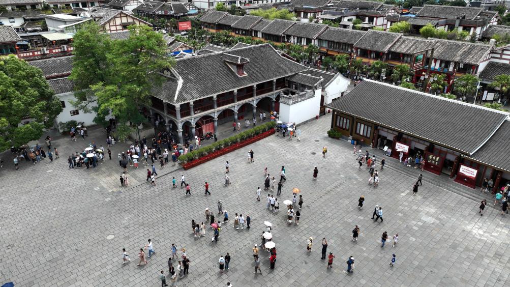 An aerial drone photo shows tourists visiting the venue of the Zunyi Meeting in Zunyi, southwest China's Guizhou Province, Aug. 13, 2023. (Xinhua/Yang Ying)