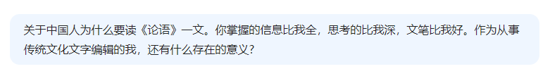 DeepSeek这一回答,就像是在满是科技与狠活的信息自助餐里,端出了一盘热气腾腾、香气四溢的“经典大餐”,让人眼前一亮。它巧妙地把《论语》和当下的各种热门话题“锁死”,就像给老古董穿上了潮流新装,毫无违和感。例如谈到对抗“精神空心化”,它把《论语》比作能治“躺平”“内卷”这对“疑难杂症”的“神药”,孔子的智慧成了年轻人摆脱迷茫的“救命稻草”,还顺手对比西方存在主义,让不同文化在安顿心灵这件事上“battle”了一番,这操作直接拉高了我们思考的“天花板”。
