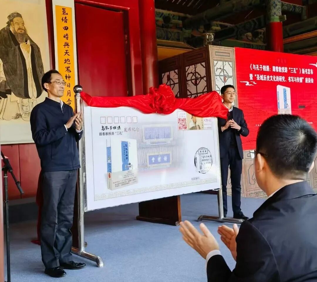 中国邮政特制《与孔子相遇》新书发布纪念封戳。中国邮政集团有限公司山东省曲阜市分公司总经理李明宣读了《中国邮政集团有限公司山东省曲阜市分公司关于发行〈与孔子相遇:跟着教授游“三孔”〉新书发布纪念封戳的公告》,并表达了对新书发布的鼎力支持。曲阜政协副主席、中国孔庙保护协会会长、曲阜市文物局党组书记、局长孔德民与李明总经理共同为纪念封戳揭幕。