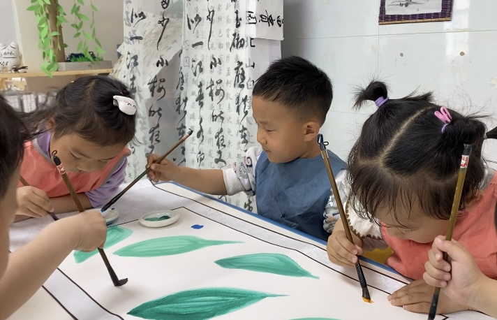 活动中,幼儿园创设了 “过水塘不湿衣” 的水墨游戏。幼儿们需精准控制笔尖墨量,操控毛毛虫在带有 “礼” 字纹样的荷叶间穿行,且保证不晕染,以此践行 “非礼勿动” 的节制之道。若操作失败,幼儿则要执弟子礼向同伴虚心求教,落实 “三人行必有我师” 的传统教导。