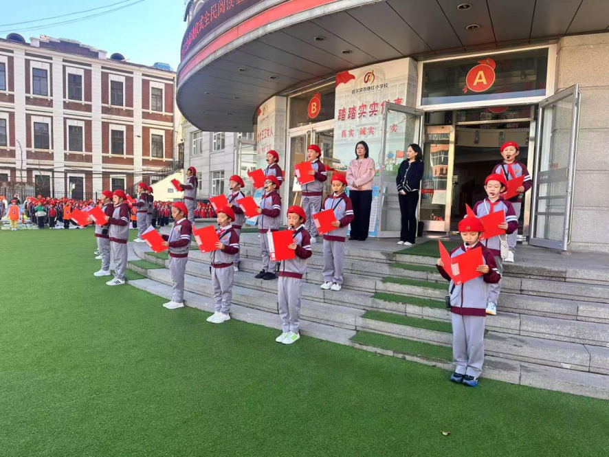 “还记得你上次读书是什么时候吗?”“通过亲子诵读《论语》,我们与先贤对话,感受他们的智慧与情怀,汲取前行的力量,让生命的羽翼在思想的浸润下愈发丰满坚实。”五年级十班学生代表孙宁阳以稚嫩而坚定的声音宣读全民阅读倡议书,一句 “放下手机读读本书”,道出了在数字化时代对深度阅读的渴望。