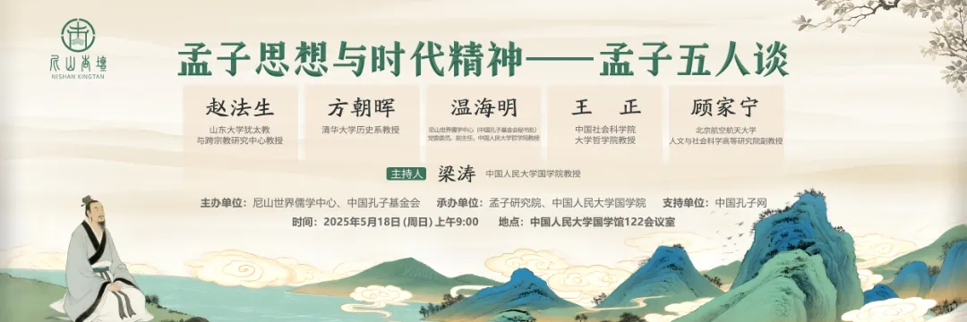 5月18日,“尼山杏坛·孟子思想与时代精神——孟子五人谈”将在中国人民大学国学馆开讲,届时来自国内知名高校的专家学者将围绕孟子思想及其时代精神共同探讨、交流思想,让孟子思想在新时代焕发出蓬勃生机与活力,更好促进中华优秀传统文化创造性转化、创新性发展。