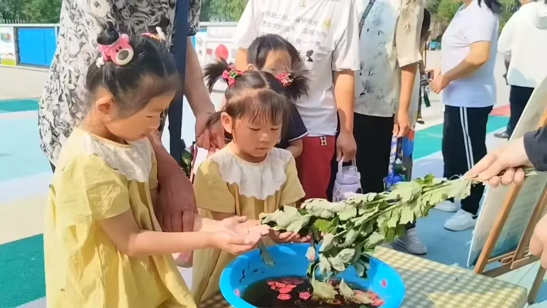活动现场,浓郁的节日氛围扑面而来。孩子们踏着铺满艾叶的红毯入场,艾叶散发的特殊香味不仅能防蚊虫叮咬,更寄托着 “一年精神好,百毒不侵,百病不生” 的美好寓意。随后,老师为幼儿们点朱砂,额间一点红,寓意开启智慧、平安健康;赠送装有艾叶、丁香等中药材的精致香囊,祝福孩子们驱虫避瘟、茁壮成长;以艾草和草药熬制的兰汤净手环节,让孩子们皮肤清洁,祛病安康。