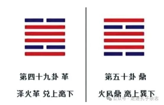 《革》和《鼎》是《周易》六十四卦中的第四十九卦和第五十卦,二者并列在一起,互为覆卦关系。《革》卦的卦辞为:“巳日乃孚。元亨,利贞,悔亡。”“巳”为“己”之通假,天干中“己”为土,土主信,故卦辞的意思是改革的时机到了,才能获得民众的信任和响应,前途就会变得亨通,利于坚守正道,悔恨也终将会消去。《革》卦的卦象是下离上兑。离为火,兑为泽。《易传》:“水火相会,其气必革。泽中有火,革之时也。”(朱震:《汉上易传》卷五)简言之,《革》卦是水火相叠,由于水火互不相容,必然变革。