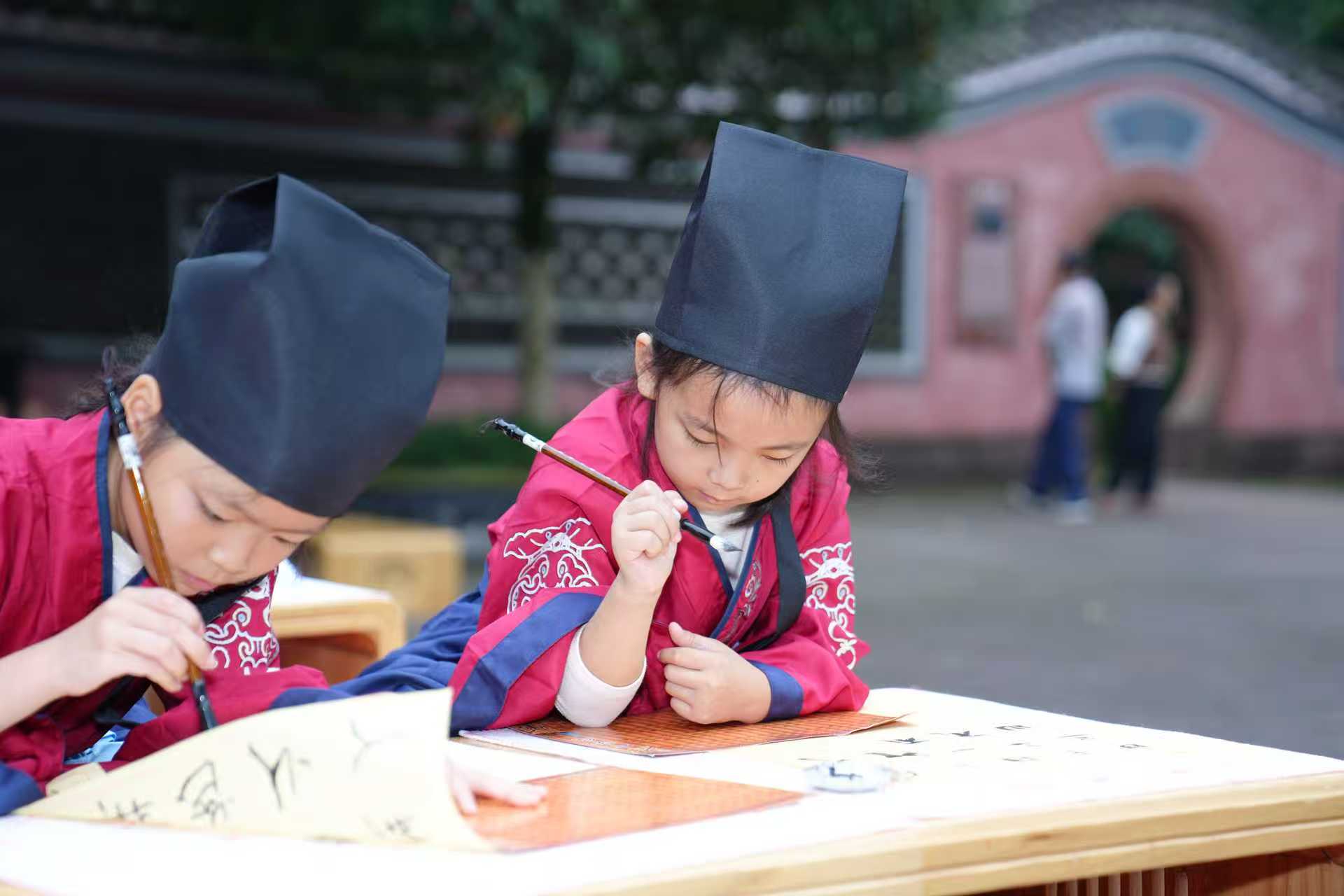 祭孔大典后,一场别开生面的“开笔礼”在文庙前广场举行。百余名身着孩童在师长引领下,依次完成“正衣冠”“朱砂启智”“击鼓明志”“启蒙描红”等传统仪程。孩子们以毛笔蘸墨写下“人”字,寓意堂堂正正立身做人。鸿渐书院张浩然现场讲解“开笔礼”的文化深意:“这一仪式承载着‘耕读传家’的家风传承,我们希望通过沉浸式教育,在孩子心中种下文化自信的种子。”