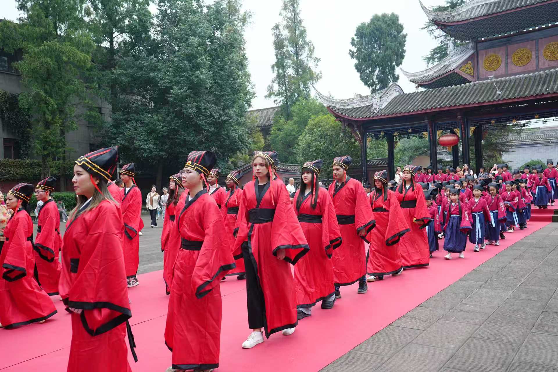 随着“启户”声响起,近百名执事生依明代礼制,经泮池、棂星门缓步至大成殿前。在《论语》诵读声中,“迎神、初献、读祝、亚献、终献、送神”六大仪程次第展开,来自西南财经大学国际教育学院的18名留学生、成都师范学院中华传统文化学院30名学子及72名本地中小学生共同见证这一盛典。活动通过云端向全球直播,吸引众多观众线上参与。