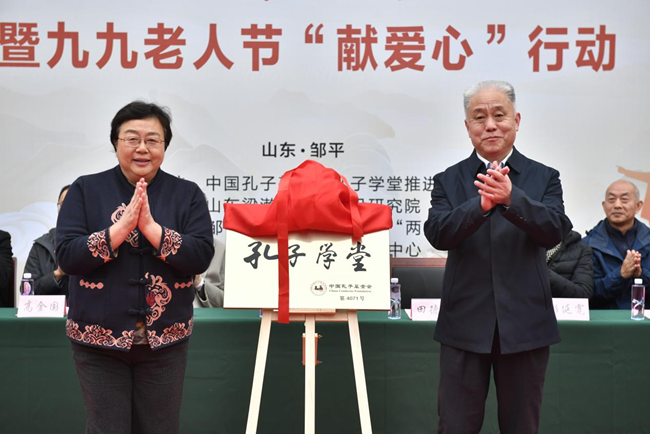 10月26日,主题为“弘扬儒家文化,助推文明乡风”的九九老人节“献爱心”行动在邹平温情启动。尼山世界儒学中心(中国孔子基金会秘书处)党委委员、副秘书长、中国孔子基金会孔子学堂推进委员会主任周静,邹平市政协副主席、市工商联主席、民盟梁漱溟支部主委田德民参加活动并致辞,为新设立的见埠村孔子学堂授牌。见埠村孔子学堂卫生院、幸福养老院同时揭牌。