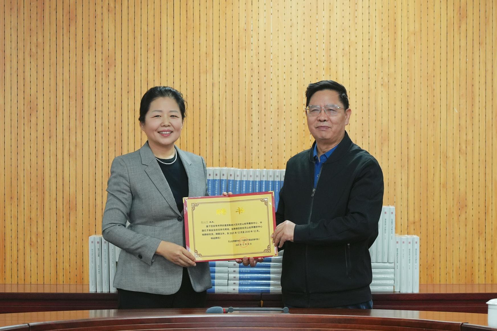 为进一步增强尼山世界儒学中心的学术影响力,儒学中心聘请“尼山文库”的作者担任“尼山世界儒学中心特聘研究员”。国承彦为“尼山文库”作者代表颜炳罡颁发“特聘研究员”聘书。