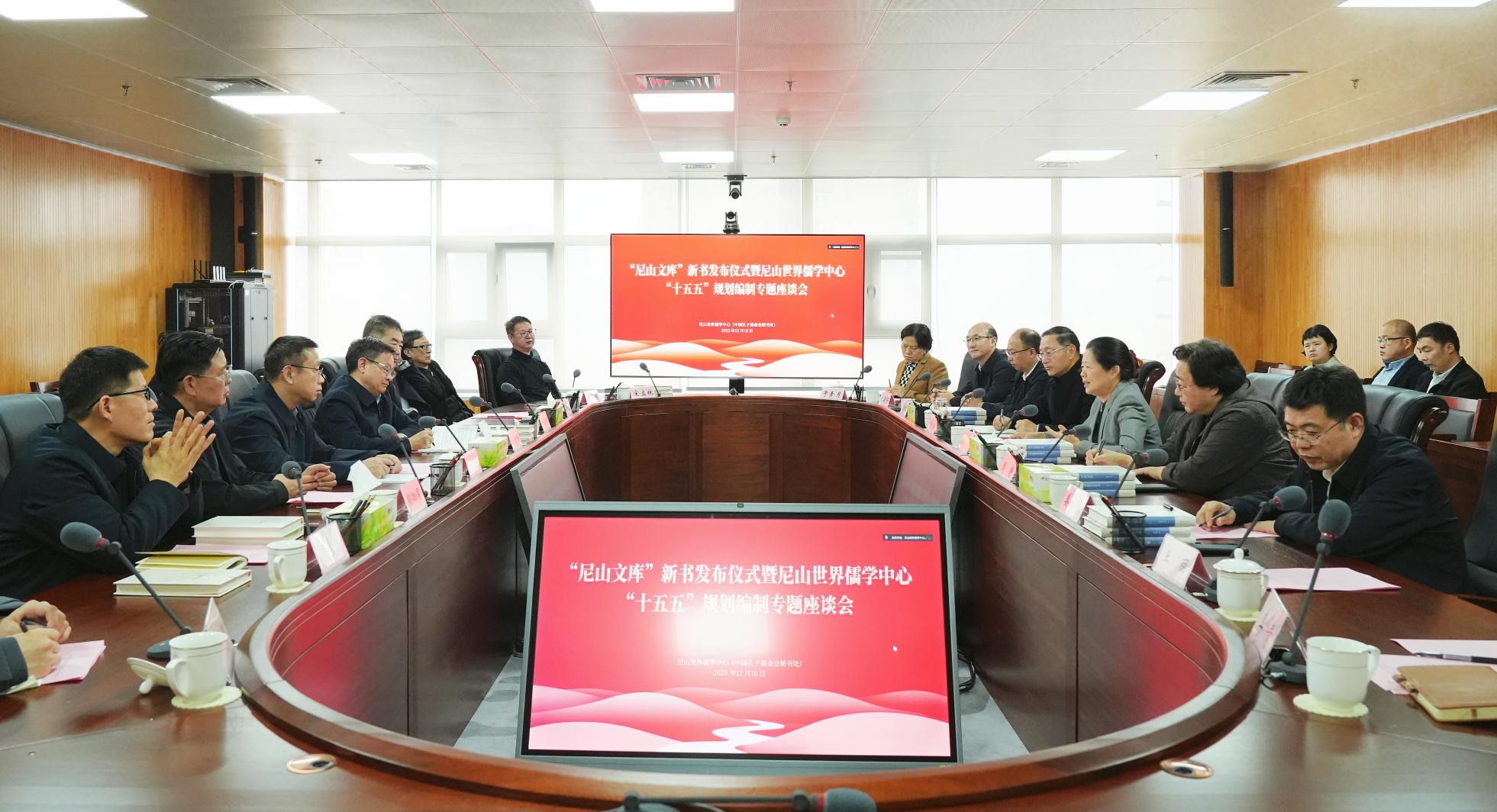 12月16日上午,“尼山文库”新书发布仪式暨尼山世界儒学中心“十五五”规划编制专题座谈会在济南举行。尼山世界儒学中心(中国孔子基金会秘书处)党委书记、副主任、中国孔子基金会副理事长、秘书长国承彦,山东出版集团党委书记、董事长刘文强出席,并共同为“尼山文库”新书揭幕。儒学中心(基金会秘书处)党委委员、副主任刘皓主持会议。