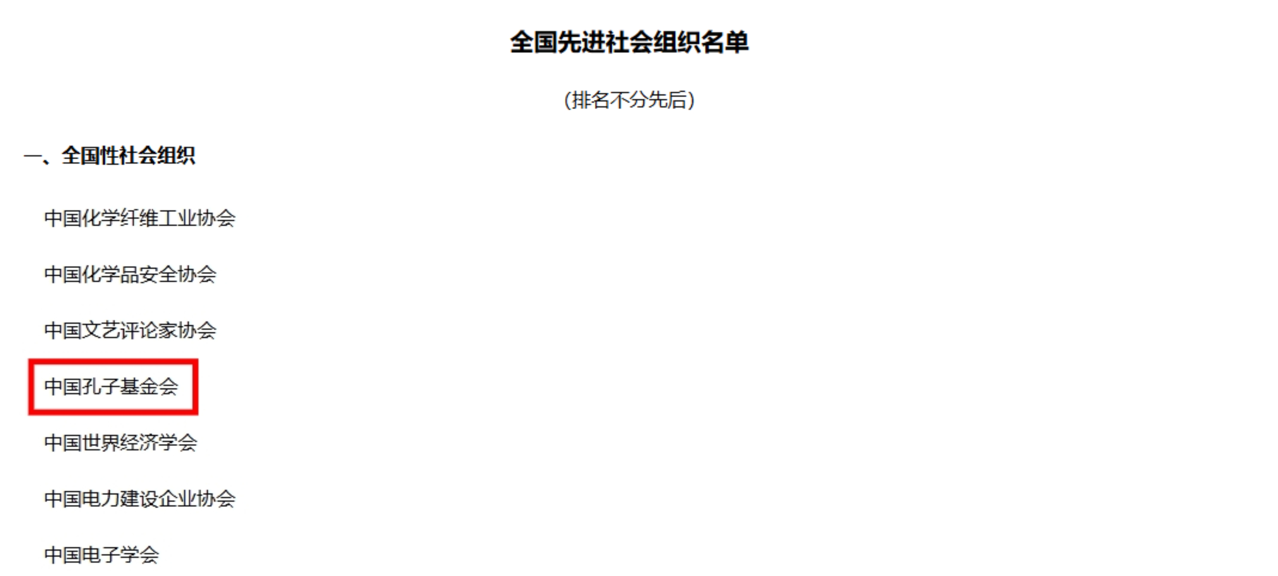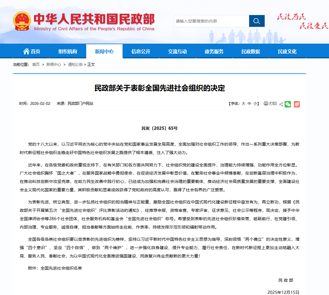 民政部为表彰先进、树立典型,进一步弘扬社会组织的担当精神与正能量,激励全国社会组织在中国式现代化建设新征程中奋发有为、再立新功,经推荐申报、资格审查、专家评审、征求意见、社会公示等程序,包括中国孔子基金会在内的286个社会团体、社会服务机构和基金会被授予“全国先进社会组织”称号。