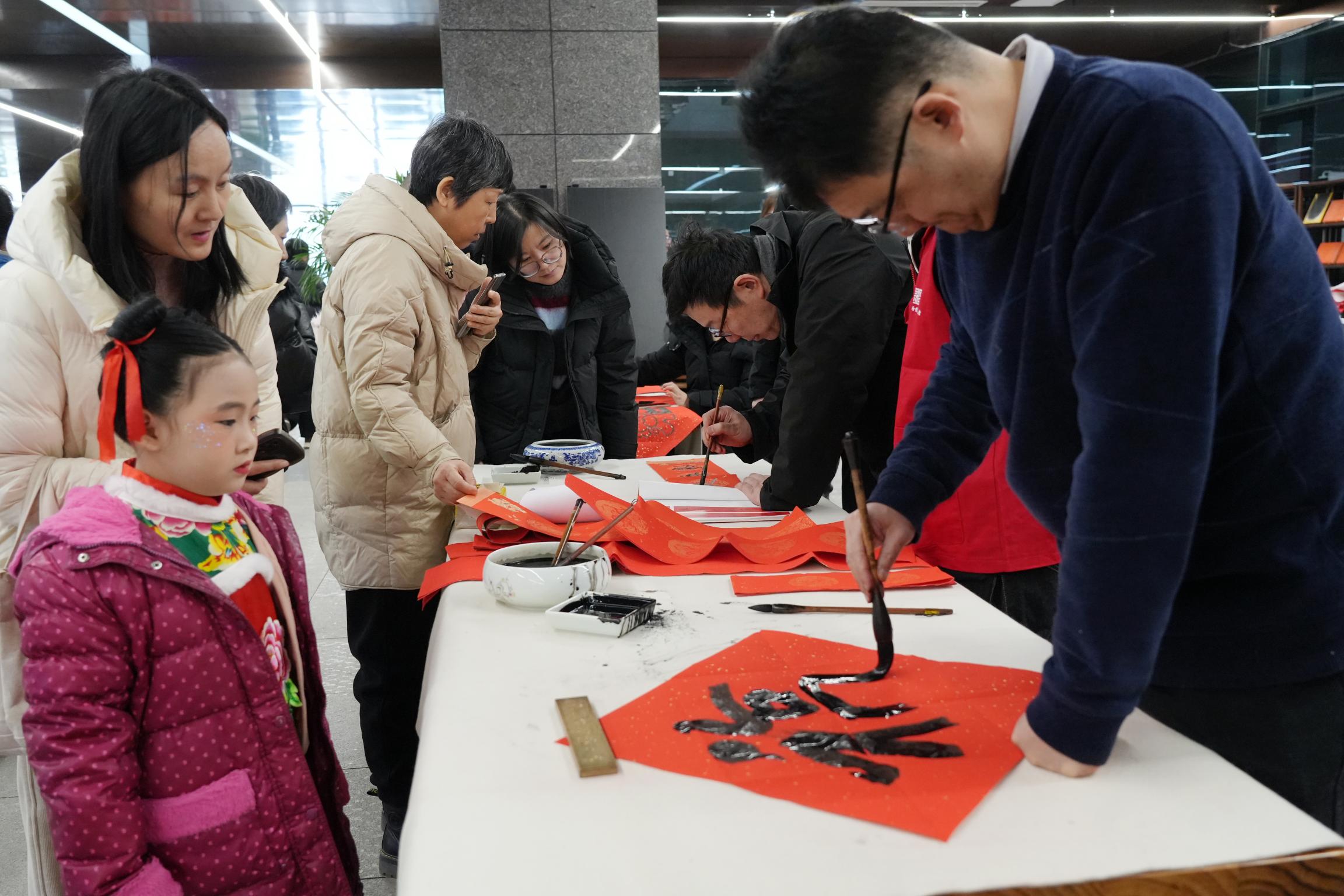 在写福字、写春联的摊位前,更是排起了长长的队伍。几位书法爱好者一边书写,一边询问市民的需求,有的市民特意叮嘱志愿者,要在春联中加入“马”的元素,期盼新的一年能够“一马当先”“万事顺意”。志愿者们表示,能在小年这天为大家免费书写春联、送上祝福,既传递了新春的暖意,也传播了书法文化,很有意义。