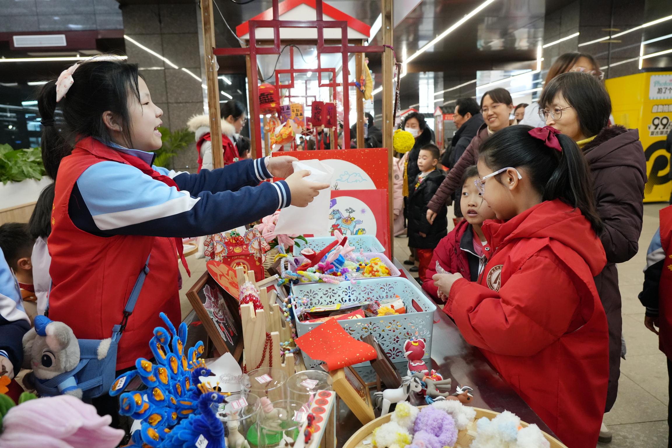 “我们组织孩子们开展公益义卖活动,一方面是想让孩子们在动手制作手工作品的过程中,感受传统年俗文化,体验劳动的快乐;另一方面,也是想通过义卖,筹集善款,帮助需要帮助的人,让孩子们在奉献中成长。”带队老师魏星介绍。8岁的仲芸萱和10岁的李怡萱热情地向游客介绍她们的手工作品,真诚的笑容、可爱的作品,吸引了不少游客驻足购买,在收获年味与祝福的同时,也传递着爱心与温暖。