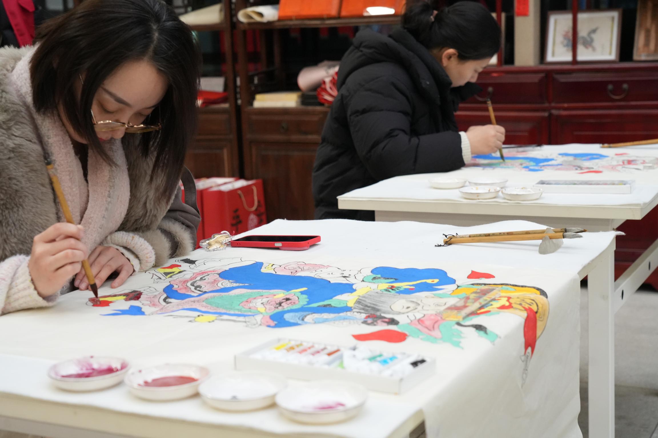 雕版印刷体验区同样热闹非凡,工作人员为过年特意复刻了门神模板。市民们围在案前,手持画笔,小心翼翼地为门神涂色。大人带着孩子一起动手,一边涂色,一边听工作人员讲解雕版印刷的历史和门神的文化寓意,在动手体验中,感受传统文化的魅力,也把马年的平安祝福,亲手“印”进心里。