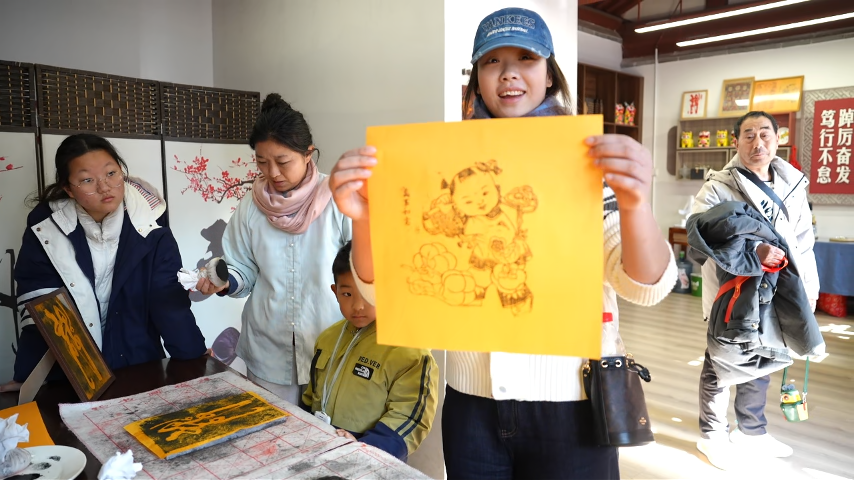 在游艺斋,文庙开辟了非遗体验区,游客可以亲手体验制作文创作品,参与拓印“龙门石刻”、印制雕版年画与门神画等活动。现场还有以济南府学文庙建筑为基础创作的冰箱贴、将建筑与文庙小状元形象结合制作的徽章等文创产品。一位来自四川的年轻游客拿着自己的拓印作品向记者展示说:“这是我第一次体验拓印,看着纹样在自己手里一点点浮现,感觉特别神奇,相信每一位亲自体验过的人都会喜欢这个经历。”在明伦堂门口,游客还能体验传统游艺——投壶讨彩,投中即可领取一份祈福带,把对新一年的美好祝福带回家。