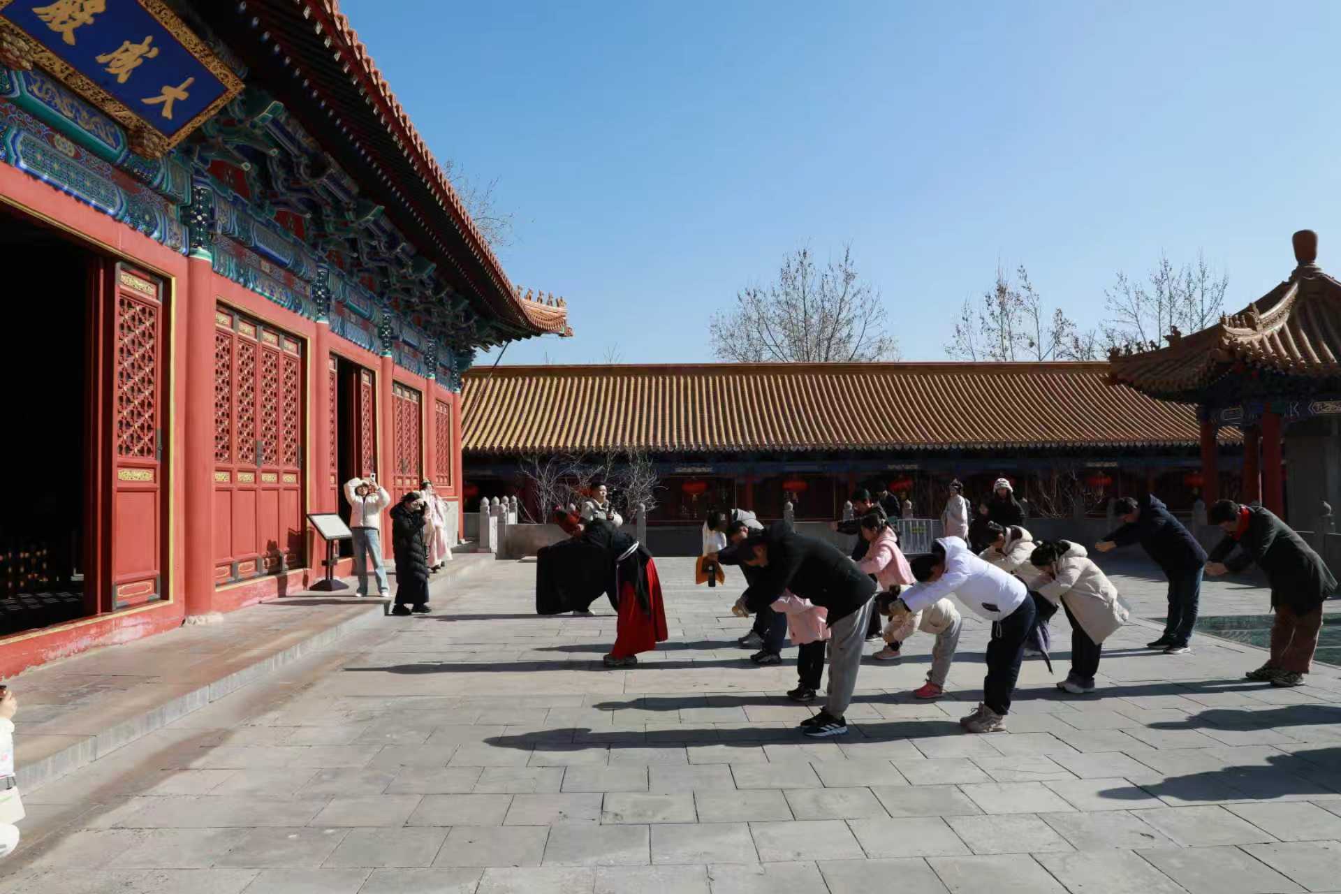 大成殿前正在举行一场新春拜孔活动,参礼者在文庙工作人员的引导下,依次完成正衣冠、行高揖四拜礼的仪式。济南府学文庙不仅完整保存了历史建筑,更延续着活态的礼仪传承,常态化举办开笔礼、成人礼、孝亲礼、拜师礼等系列古礼活动。在一些重要时间节点,还会开展特定的古礼活动,例如每年9月28日举行孔子诞辰纪念活动,每年大年初一举行新春祈福活动。这些古礼活动全年举办约百场,贯穿四季。