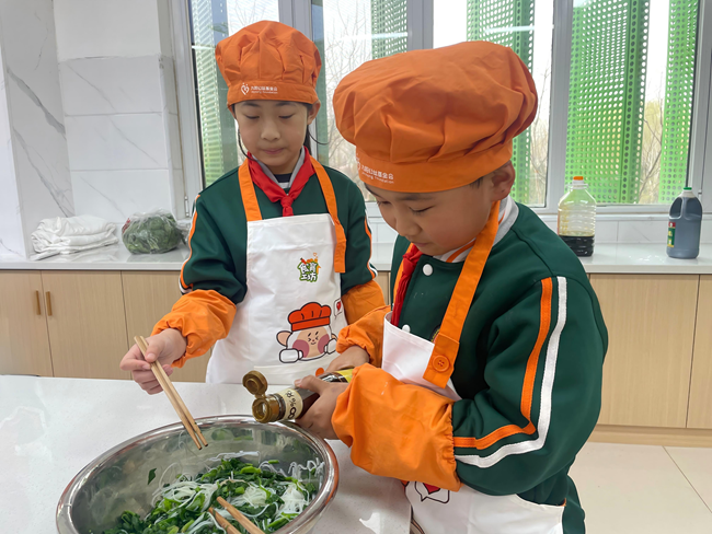 收获结束后,同学们在老师指导下对菠菜进行整理、清洗和分装,亲身感受食物从田间到餐桌的每一个环节,进一步增强了珍惜粮食的意识。活动随后转入学校食育工坊,学生们分组协作,动手制作菠菜粉丝。从焯水、切段到凉拌调味,大家有条不紊、配合默契,最终制作出色香味俱佳的菜肴。品尝着自己的劳动成果,同学们纷纷表示,这不仅是一道菜,更是一份成长的滋味。
